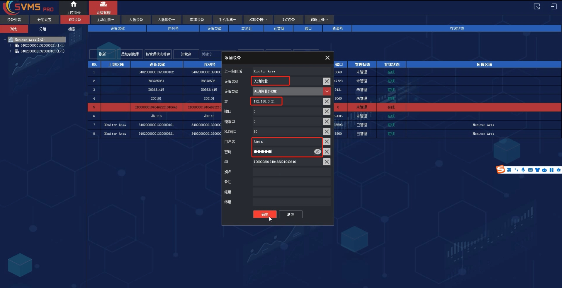 步骤二:登录SVMSPro客户端,进设备管理-NAT设备,设备注册过了后会有对应的ID在下面列出来,左边组织树创建相应的区域,