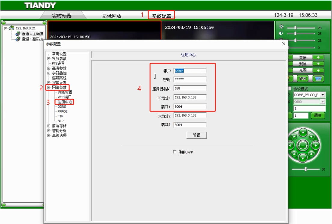步骤一:进天地伟业网页或者NVR界面进参数配置选项,左边选网络参数-注册中心,填写平台信息