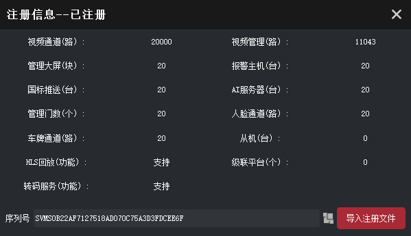 如下图所示:注册信息面板展示视频管理注册路数,以及其他功能模块注册信息。